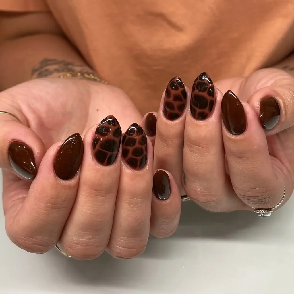 Soft metallic coffee nail design for chic style shines through this bold mocha crocodile look. A rich brown base gives each nail a warm, glossy tone that instantly draws the eye. Subtle crocodile-pattern accents add texture and depth, creating a stylish contrast that feels modern yet earthy. Each stroke reflects a mix of softness and edge, making the design stand out without feeling too loud.