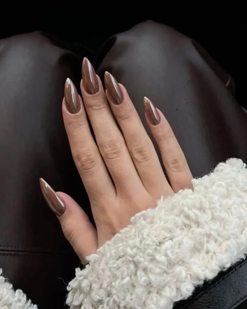 The almond shape enhances the smooth shine while giving the hands an elegant, elongated appearance. Paired with simple rings or a cozy sweater, this look brings a refined touch to everyday outfits. Anyone who enjoys coffee-inspired shades with a creative twist will find this manicure both expressive and wearable.