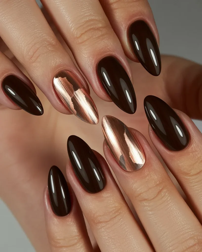 Soft metallic coffee nail design for chic style comes to life beautifully in this look, blending rich espresso tones with a soft metallic touch. Each nail carries a deep glossy coffee shade that feels smooth, bold, and refined. The standout feature is the brushed metallic accent, adding a warm copper sheen that softens the entire design while giving it a stylish edge.