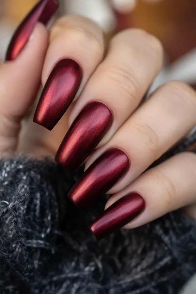 Long coffin-shaped tips give the manicure a bold presence, while the color shifts subtly under different lighting, adding dimension and mood. Each nail carries a polished elegance that pairs beautifully with cozy knits, evening outfits, or seasonal accessories. Anyone who loves warm, sultry tones will find this design both striking and wearable, making it a standout choice for fall, winter, or any stylish moment.