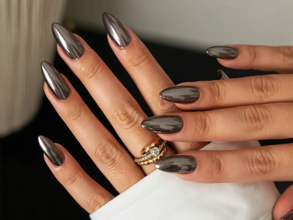 Smooth edges and an elongated shape add elegance, making the style effortless to pair with satin outfits, cozy knits, or evening accessories. Every detail feels modern yet timeless, offering a polished look that works for any season. Anyone searching for a chic, understated metallic nail idea will love how this design balances shine, softness, and sophistication.