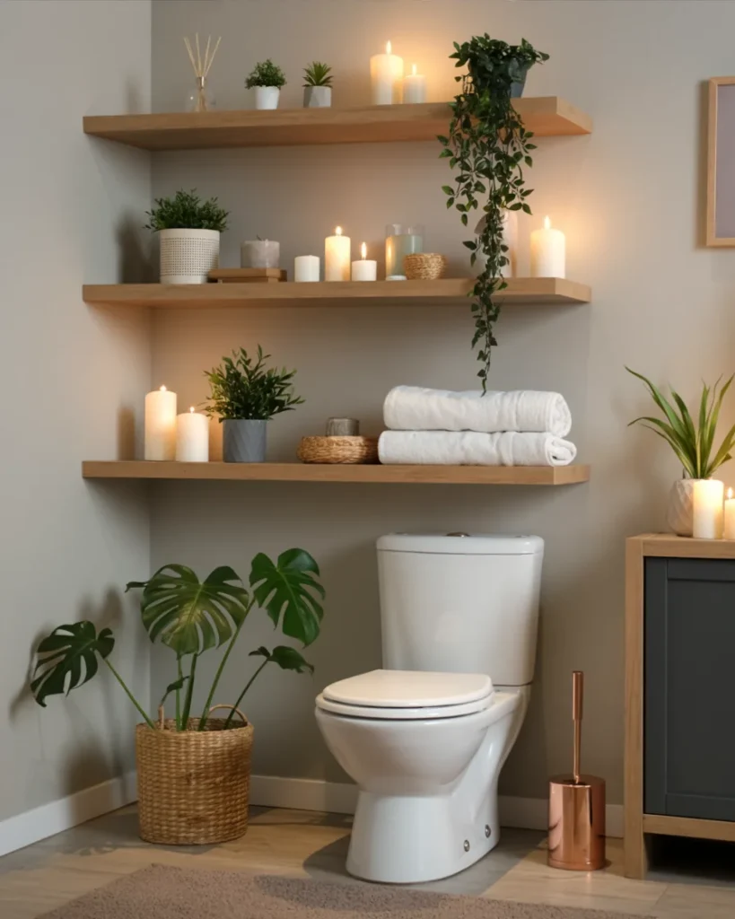 This charming bathroom setup highlights the perfect balance of functionality and decor. Wooden floating shelves are adorned with neatly stacked white towels, small plants, and soft candles, creating a relaxing atmosphere.