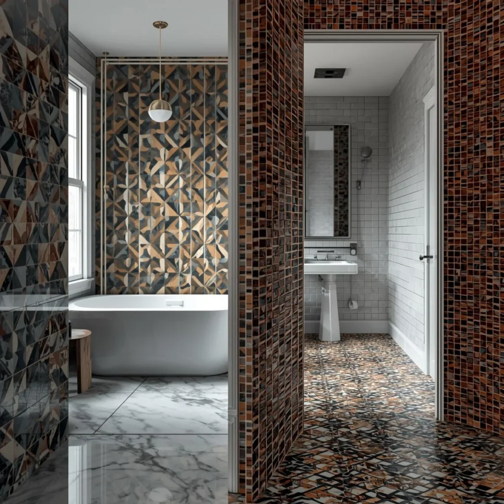 Make a statement with bold tile choices! Whether you’re going for geometric patterns, subway tiles, or colorful mosaics, tiles can bring personality and vibrancy to your bathroom. Consider using patterned tiles as a feature wall behind the bathtub or sink, or go all-in with colorful floors to create a vibrant contrast.