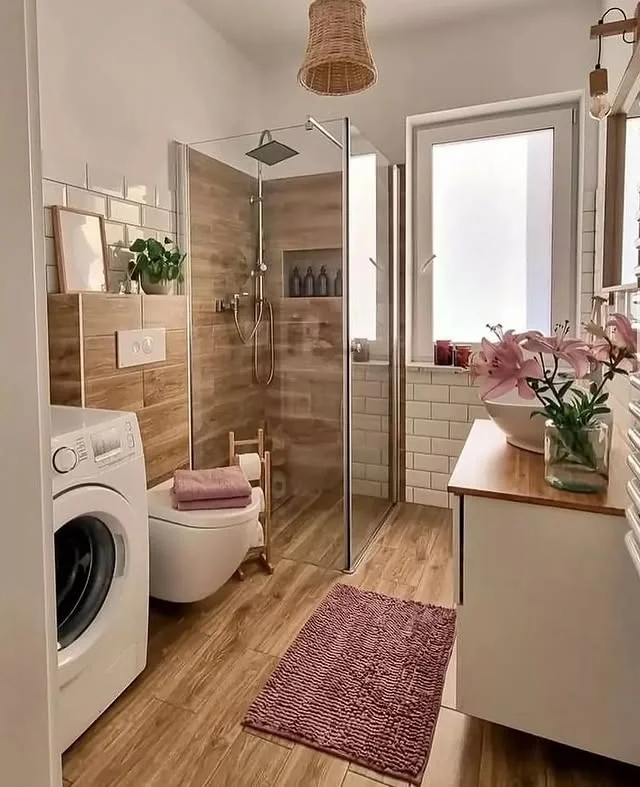 A laundry machine tucked neatly into the corner optimizes space while maintaining functionality. Fresh plants and decorative flowers on the windowsill bring a touch of nature indoors, completing the calm, serene vibe of the space.