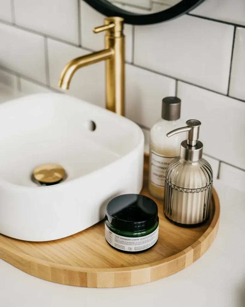 The bamboo tray adds warmth to the space, showcasing well-placed beauty essentials, such as a green jar of skincare and stylish glass bottles of lotion and soap.