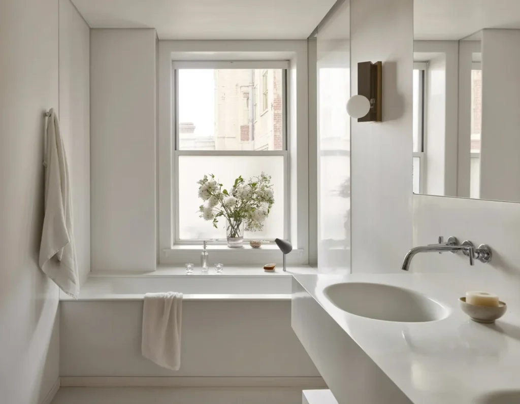 This minimalist bathroom design radiates simplicity and elegance. The all-white walls and fixtures create a serene atmosphere, while the soft touch of natural light pouring through the window adds warmth to the space.