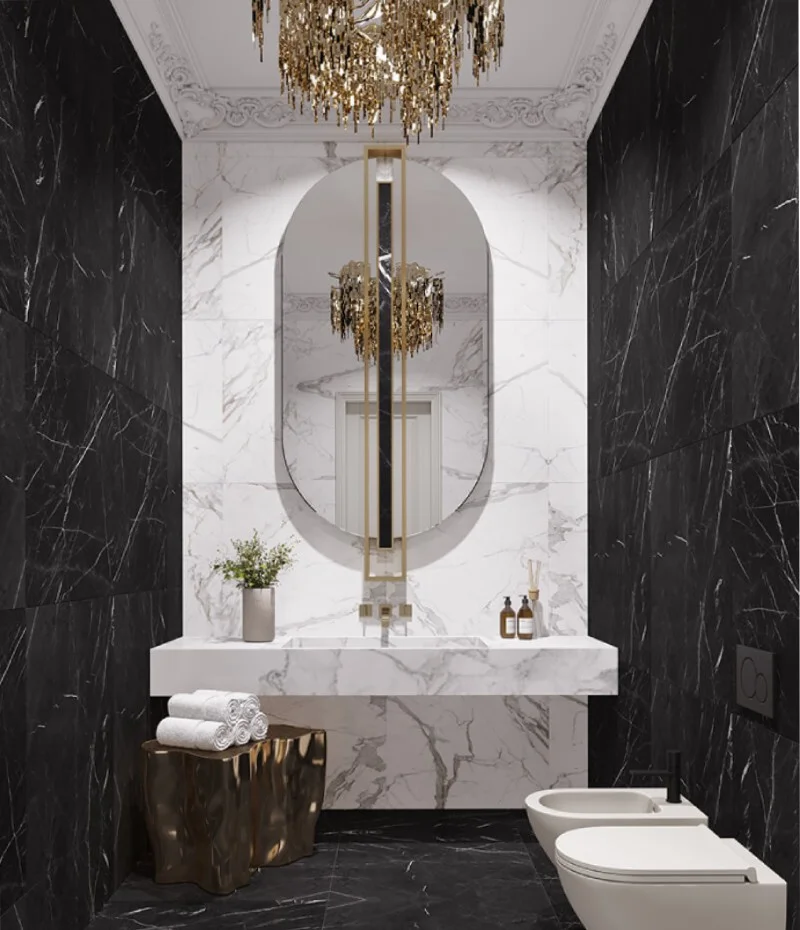 Elevate your bathroom with this stunning blend of black and white marble. The sleek modern fixtures, paired with the luxurious gold chandelier, create a timeless, elegant space. The clean lines and minimalist design ensure that the room feels both spacious and sophisticated.