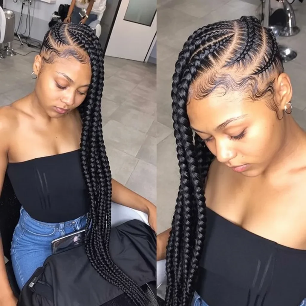 These side-swept lemonade braids offer a bold yet elegant look. The sleek, neatly parted cornrows create a sharp design, with the braids styled to one side for added volume and drama.