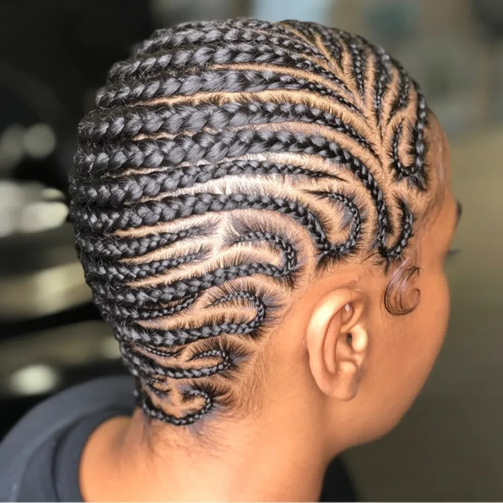This lemonade braid style offers a visually intricate design with swirling patterns along the scalp. The braids are arranged in smooth, spiral shapes, creating a stunning geometric effect.