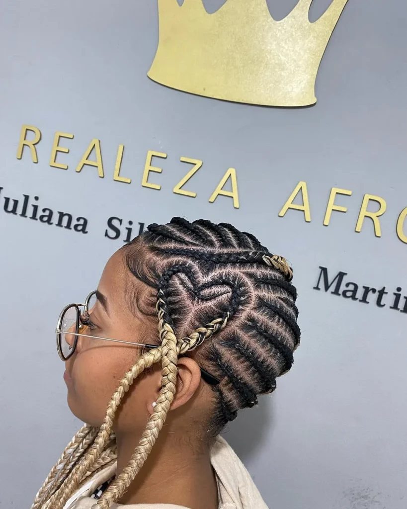 This heart-shaped lemonade braid style is both creative and bold. The intricate parting is carefully arranged into a heart shape on top, showcasing a unique twist on the classic lemonade braid.