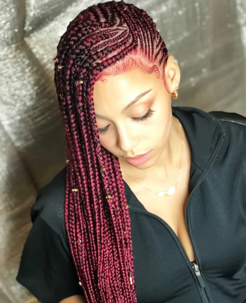 This vibrant red lemonade braid style is eye-catching and full of energy. The neat cornrows are styled into a sharp, symmetrical pattern that adds structure and definition to the overall look.