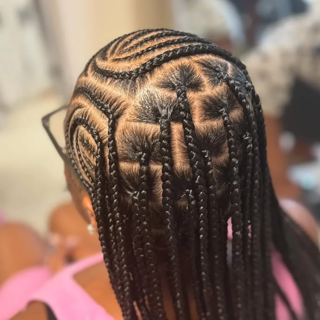 The clean, precise cornrows highlight the symmetry, adding structure and definition to the style. This unique braid arrangement not only stands out but also ensures your hair stays in place for an extended period.