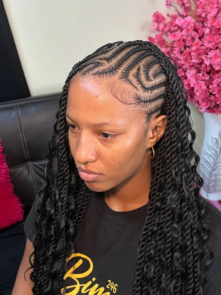 This hairstyle features a stunning blend of neat cornrows and voluminous curls. The well-defined parting creates a sharp, symmetrical look, drawing attention to the precision of the braids.