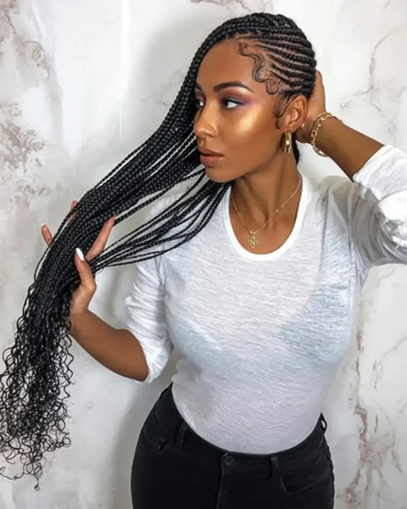 This look combines the elegance of lemonade braids with a modern twist. The neatly parted cornrows lead into curly ends, offering a playful yet sophisticated look. The curl adds volume and softness, creating a beautiful contrast against the sleek braids.