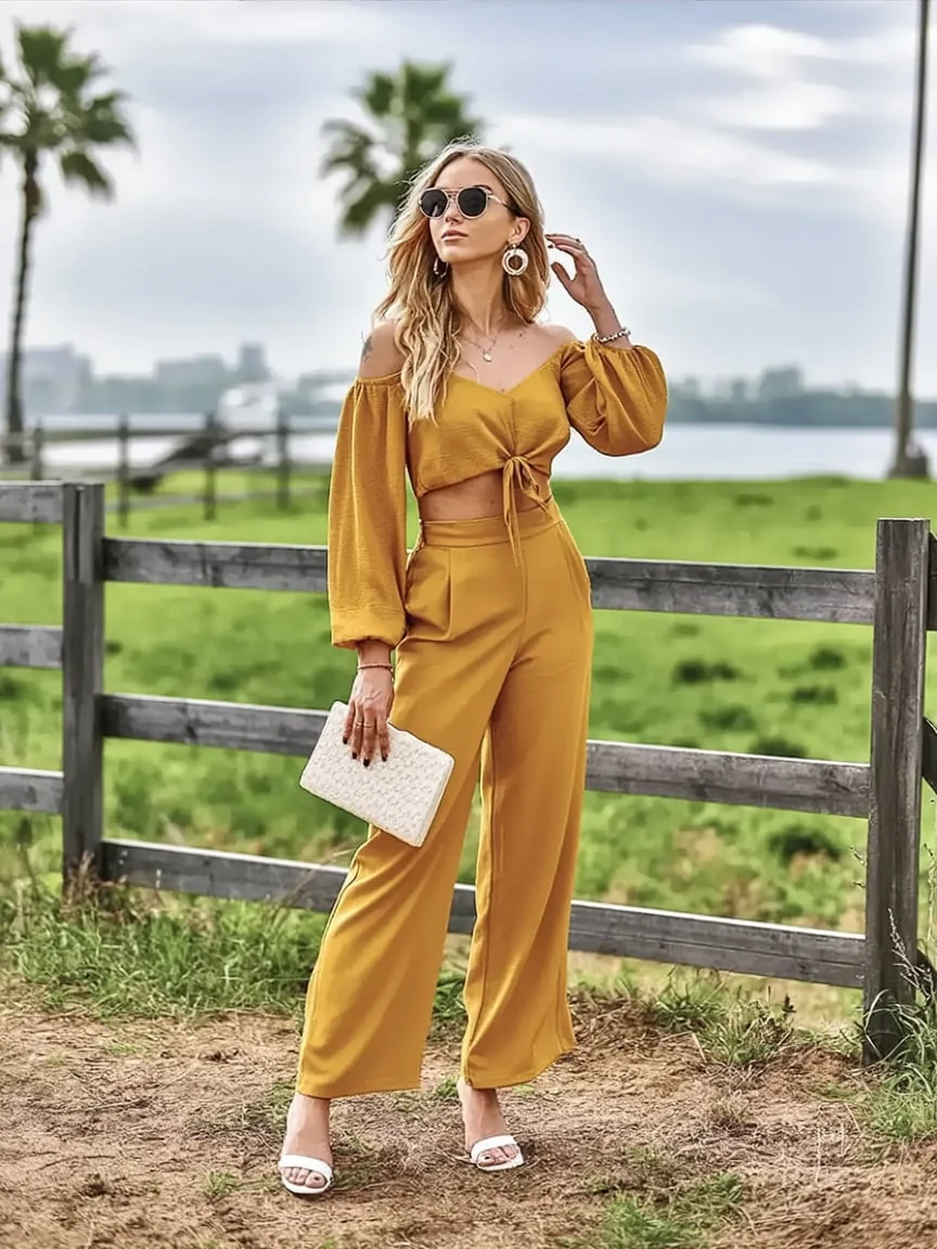 Embrace summer style with this effortlessly chic mustard yellow two-piece set. The off-the-shoulder top, with its tied knot detail at the waist, offers a feminine and playful touch, while the wide-legged pants provide both comfort and breathability, perfect for those hot, sunny days.