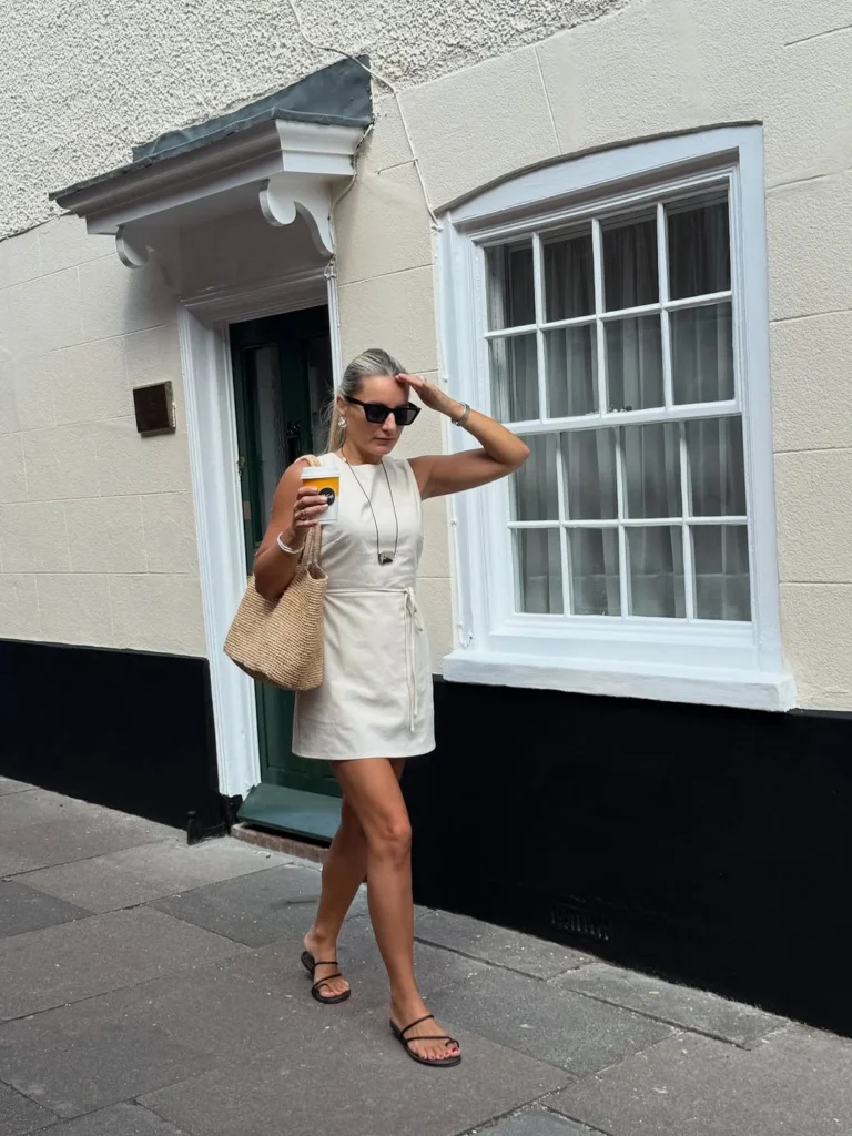 This effortlessly chic look pairs a simple, off-white dress with a drawstring waist, creating a relaxed yet flattering silhouette. Paired with black flip-flops and a tan woven bag, it strikes a balance between comfort and style, perfect for strolling through sunny streets.