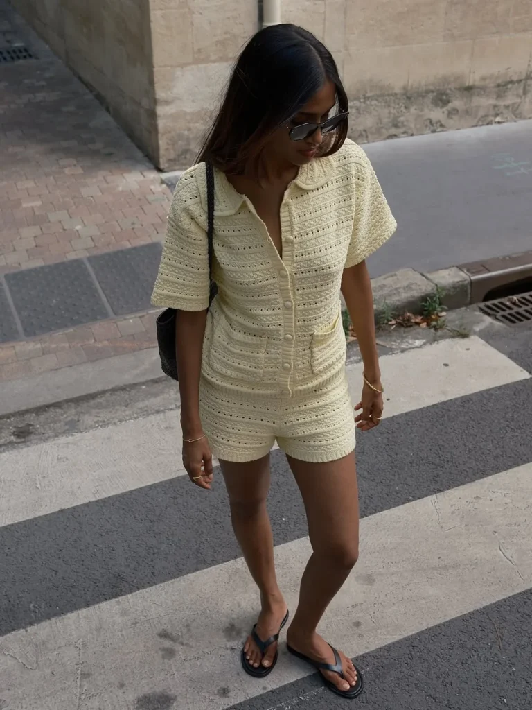 Paired with flip-flops and simple accessories, this outfit embraces effortless style while keeping you cool. The crochet texture adds a playful, vintage feel, making it a standout piece for summer fashion. The simple yet elegant design transitions easily from a day of sightseeing to an evening stroll, offering both ease and elegance in one.