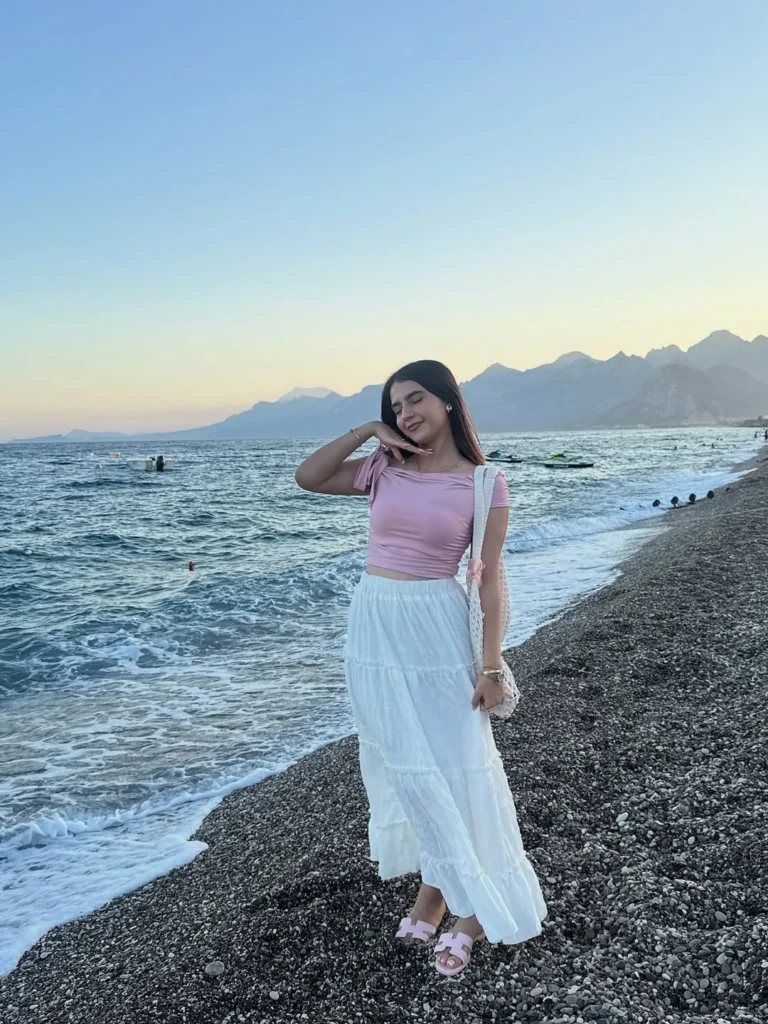 A combination of comfort and style, this outfit is perfect for a sunny day by the beach. The light pink crop top gives a soft and feminine vibe, paired with a breezy white tiered skirt that flows effortlessly in the wind. This outfit is ideal for a relaxed yet fashionable look, perfect for a day in the sun.