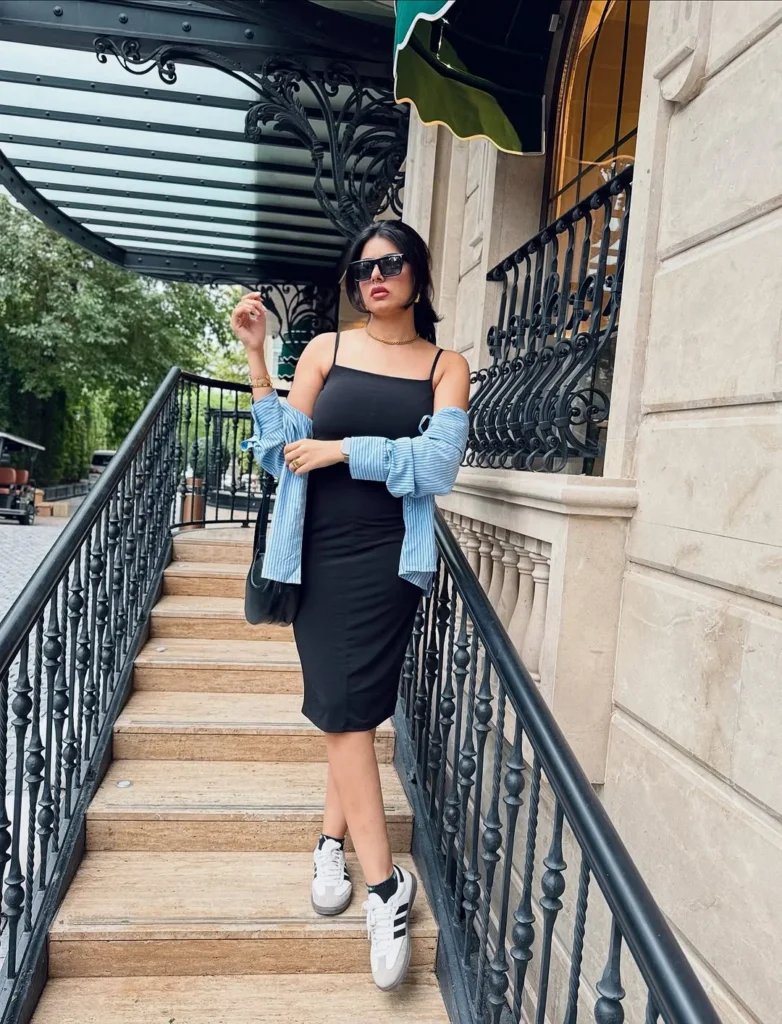 The combination of white sneakers with black accents ties in effortlessly with the overall look, offering both ease and urban edge. A sleek black bag and oversized sunglasses further elevate the outfit, exuding confidence and style. This look is versatile enough for casual outings, a day of sightseeing, or a coffee date, allowing you to embrace both comfort and elegance without compromising on style.