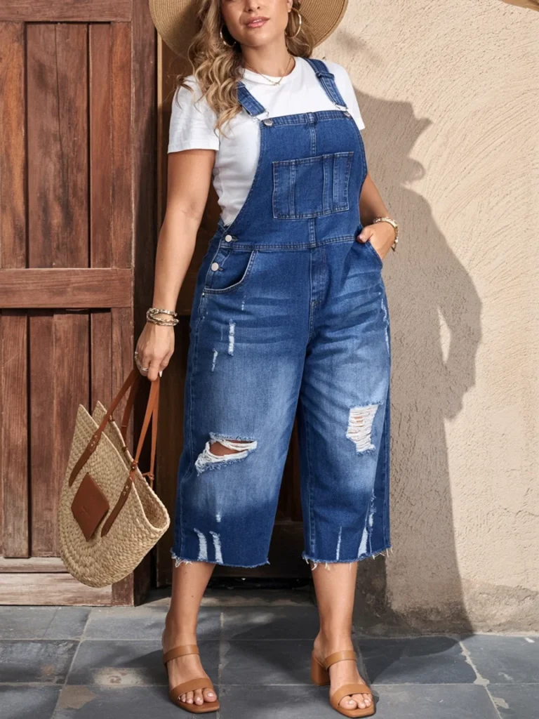 This look captures an effortlessly chic summer vibe, blending comfort and style in a fun, casual outfit. The distressed denim overalls add a playful touch, while the cropped, wide-leg design keeps it breezy and cool for warmer days. Pairing them with a simple white tee creates a clean, minimalist look, allowing the overalls to be the star of the show.
