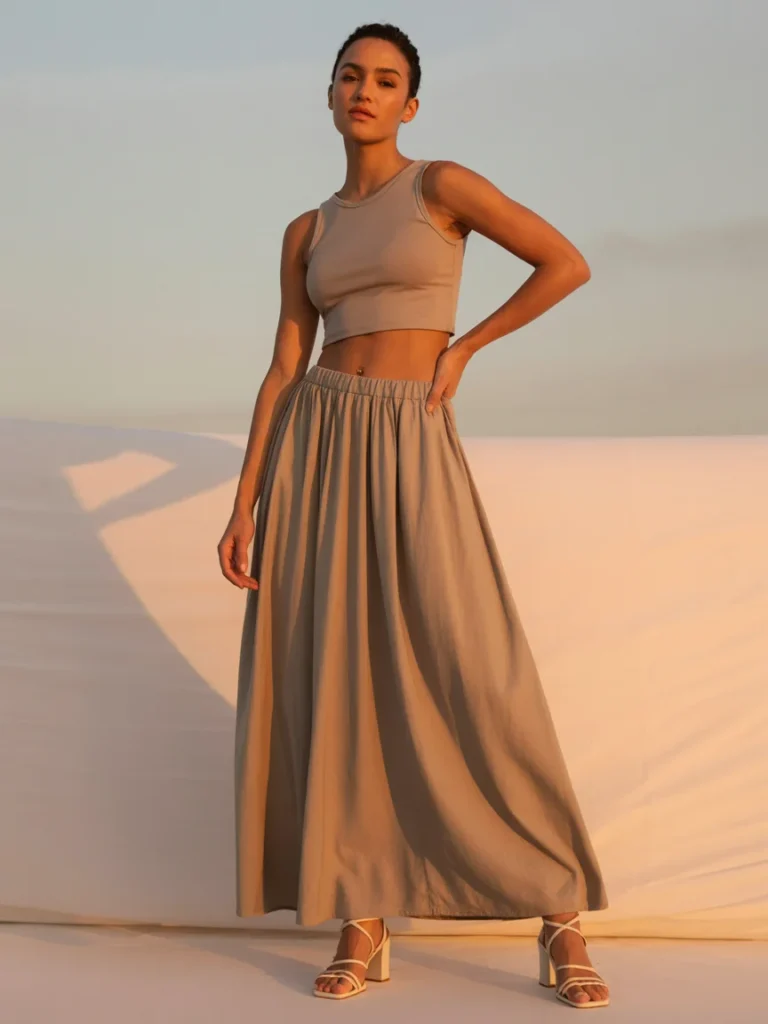 This ensemble effortlessly blends comfort with style, featuring a soft beige crop top paired with a flowing, high-waisted maxi skirt. The loose fit of the skirt ensures you stay cool while moving freely, making it perfect for a warm summer day. The neutral tones of the outfit give it a laid-back, earthy vibe, while the subtle strappy sandals add a touch of sophistication.