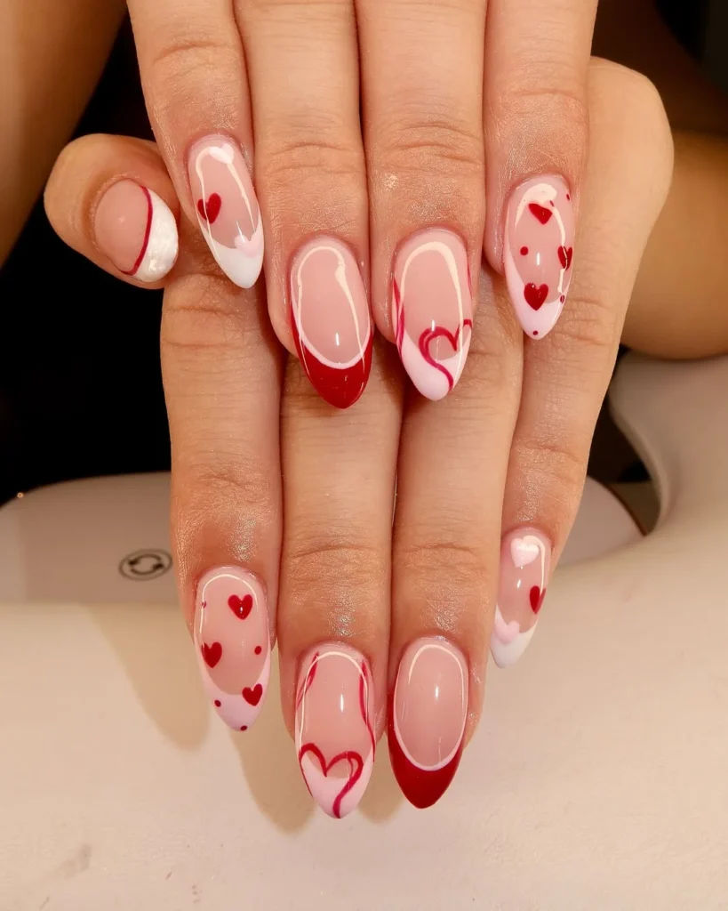 The contrast between the rich red and the soft nude base makes the design stand out without being overwhelming. Perfect for those who want a mix of fun, elegance, and love, these nails are a great choice for any Valentine’s celebration.