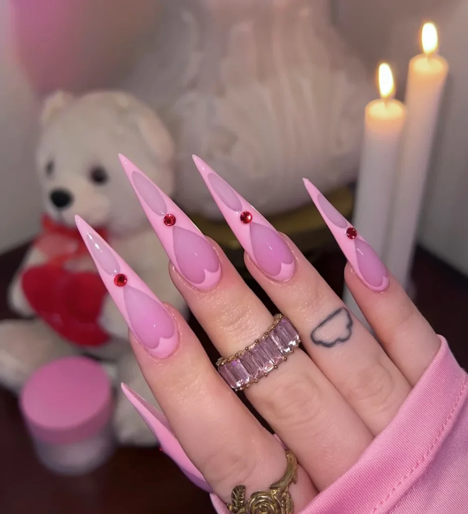 These striking stiletto nails combine a soft pink base with bold, heart-shaped designs for a romantic and eye-catching look. The glossy finish accentuates the sleek, pointed tips, creating a chic and sharp silhouette. Red rhinestones are strategically placed at the center of each heart, adding a touch of sparkle that elevates the overall design.