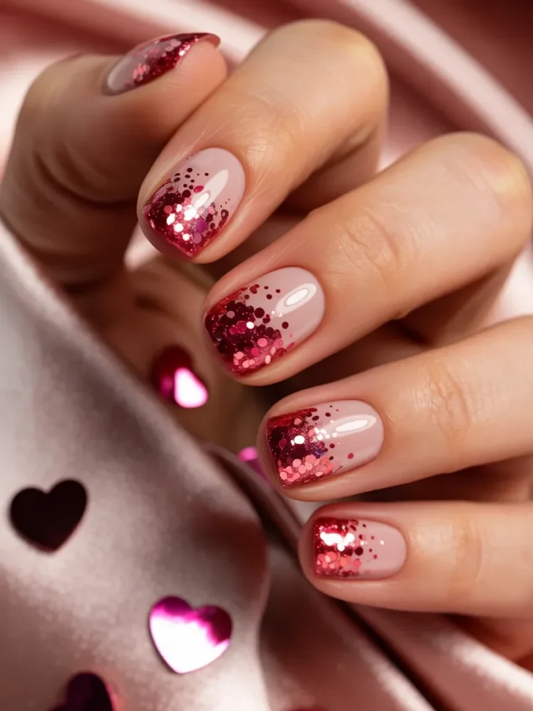 The glitter gradually intensifies, creating a shimmering effect that catches the light beautifully. Perfect for a Valentine’s Day celebration or any occasion where you want to add a touch of sparkle, these nails offer the right balance of sophistication and fun. It’s a design that brings romance, glamour, and a bit of sparkle together.