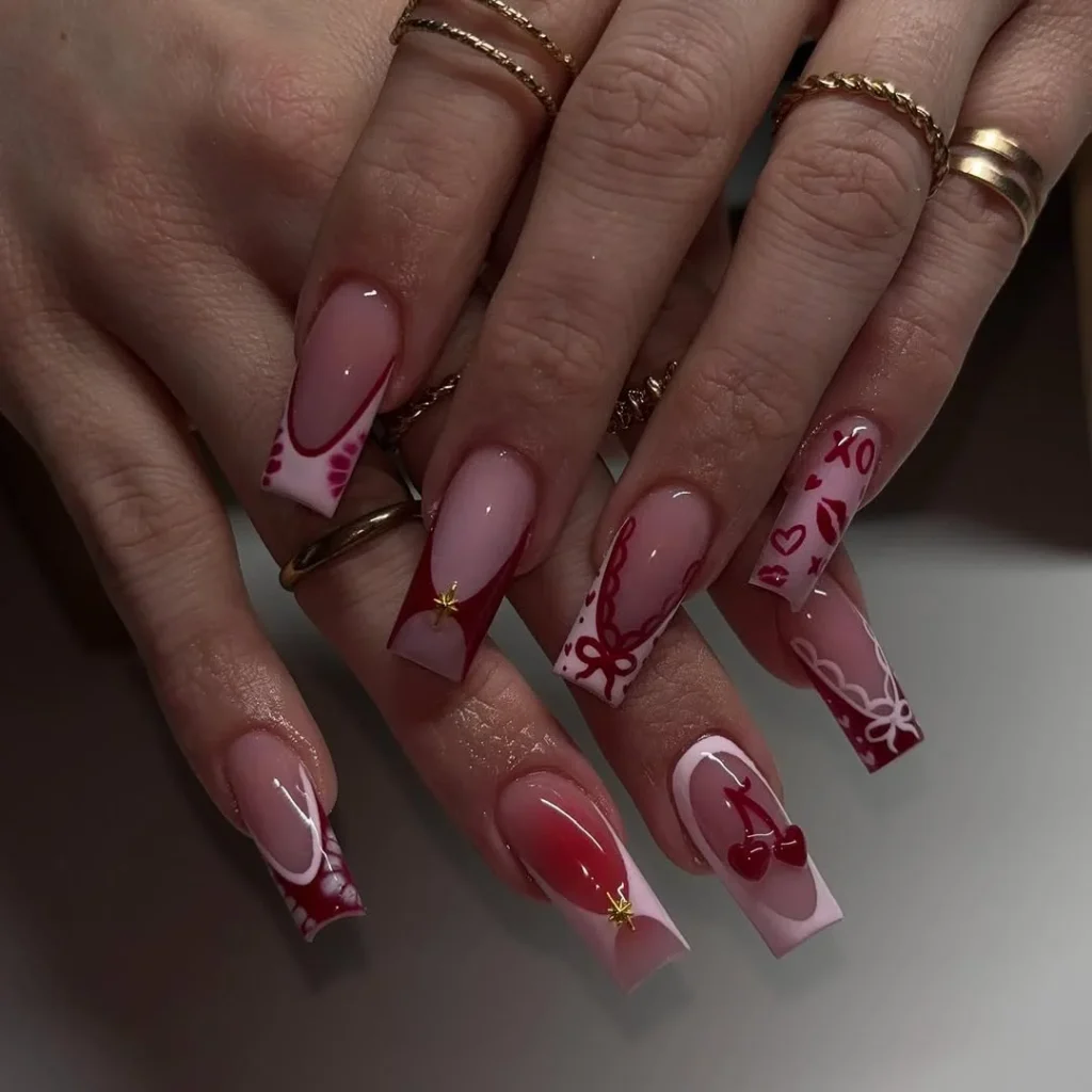 This design brings a bold twist to Valentine’s Day nails with red, pink, and white accents. Each nail showcases a unique combination of hearts, bows, and cherries, with delicate details like gold stars adding a touch of elegance.