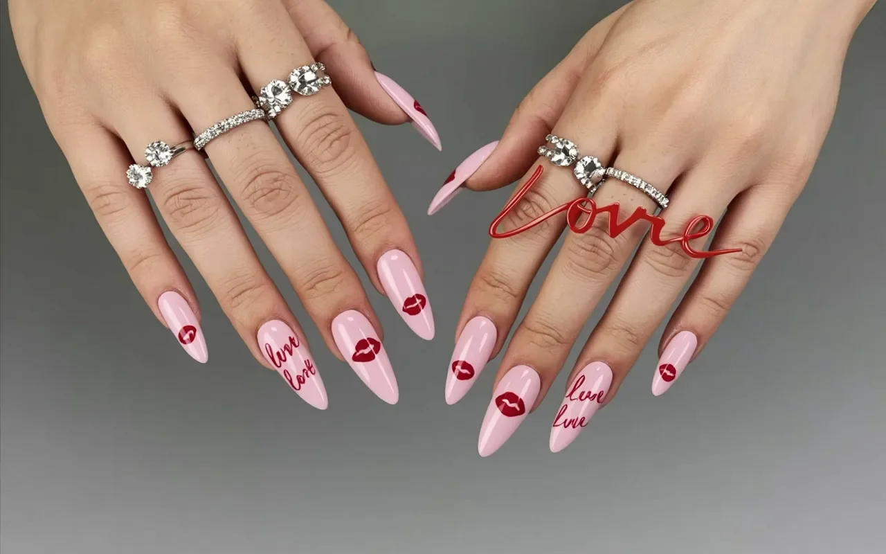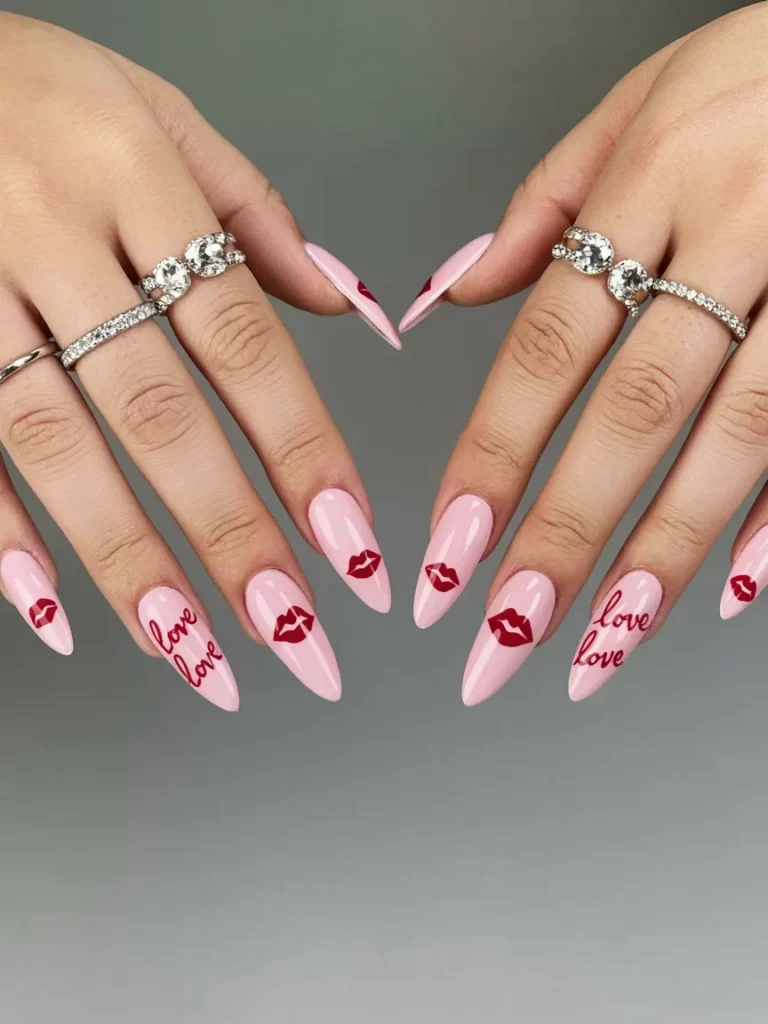 This design combines soft pink nails with bold red accents to create a playful yet romantic look. Red kiss marks are placed on each nail, adding a cheeky, flirtatious touch that’s perfect for Valentine’s Day. The word “love” written on the nails enhances the design, giving it a sentimental vibe while still keeping things fun.