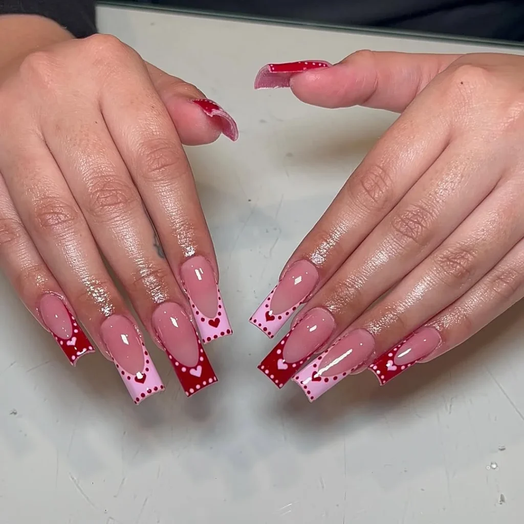 15. Red and Pink Heart French Tips