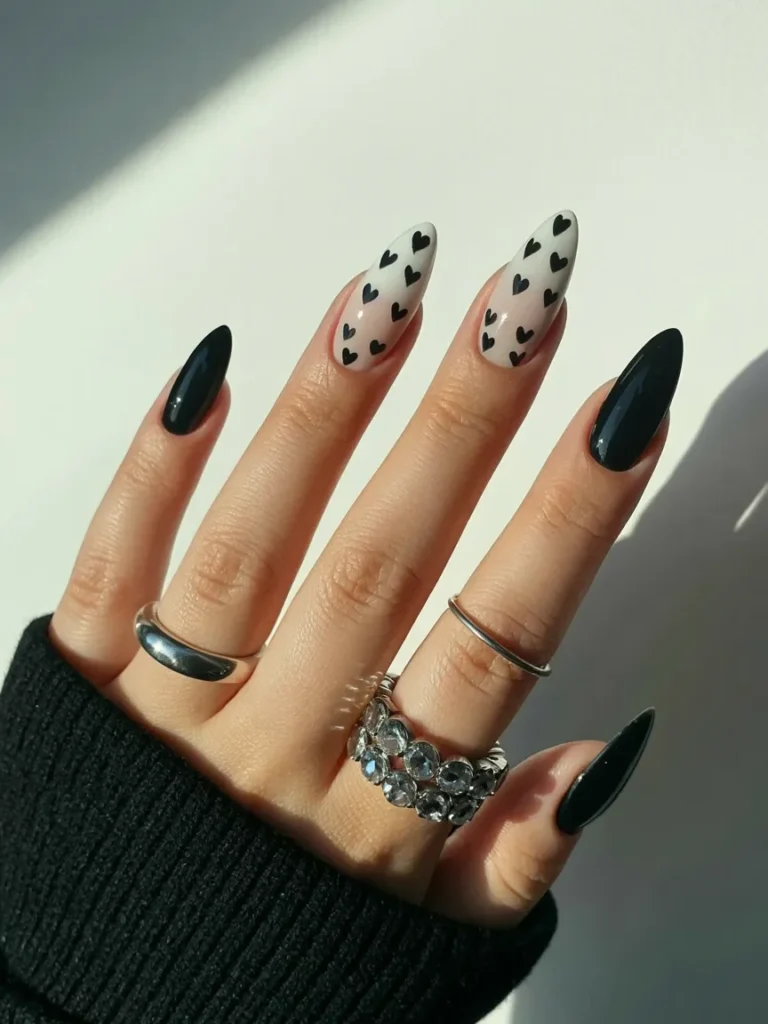 This stylish design features sleek black nails paired with a pop of contrast through white nails adorned with delicate black hearts. The combination of bold black with soft white creates a striking visual effect, making the hearts stand out beautifully.