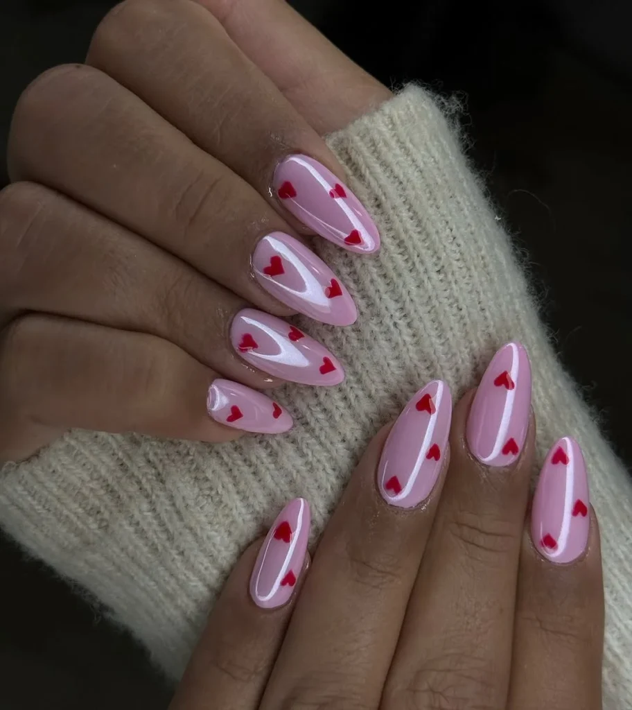 This design blends soft pink with red hearts for a sweet, Valentine’s Day-inspired look. The soft pink base creates a gentle and feminine feel, while the red hearts add a bold pop of color. Each heart is placed delicately, making the nails look fun yet refined.