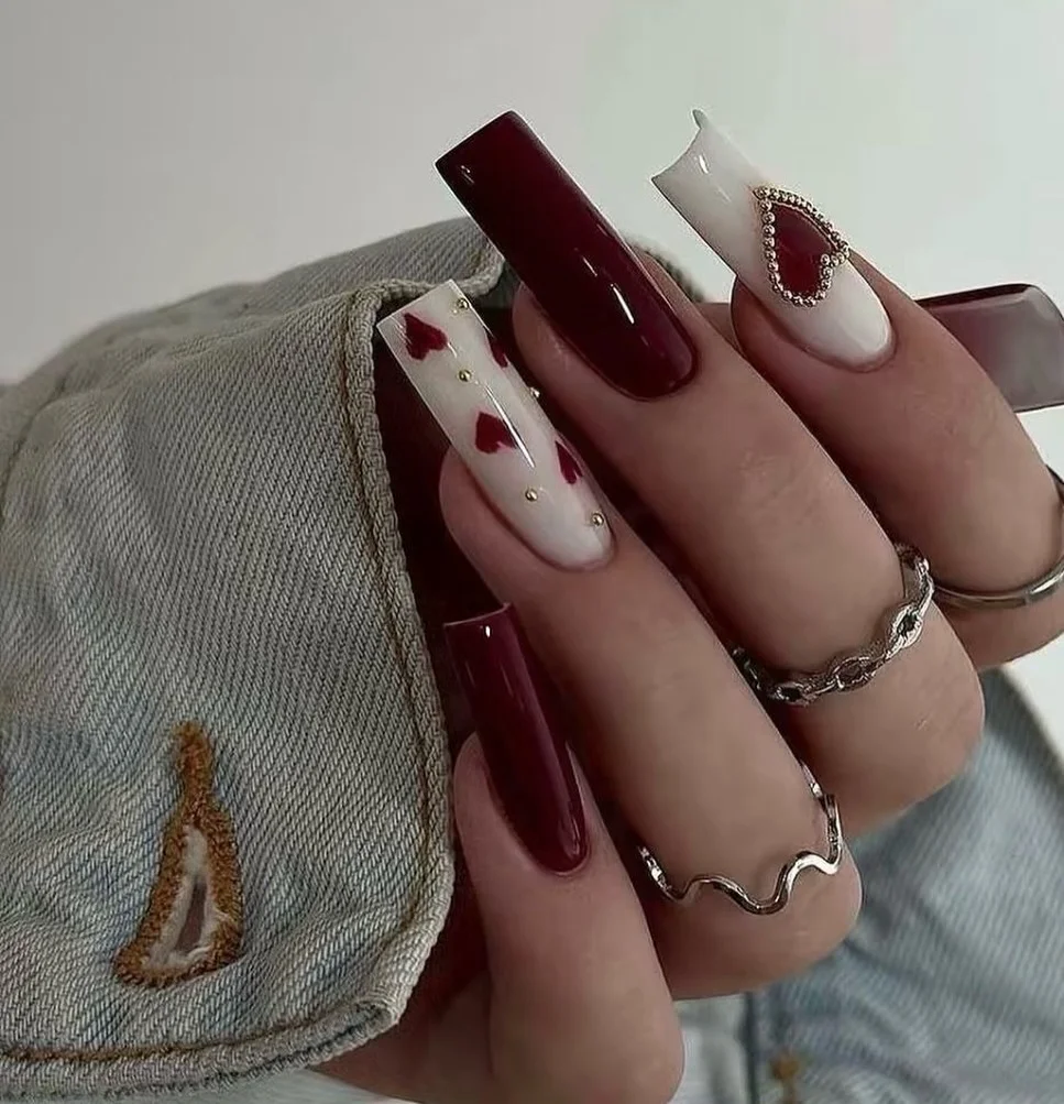 This chic Valentine’s Day design blends deep red and soft white with playful and elegant details. The deep red nails offer a bold, timeless look, while the white nails feature red hearts and gold studs, adding a romantic touch. One of the nails is adorned with a gemstone heart, enhancing the design with a bit of sparkle.