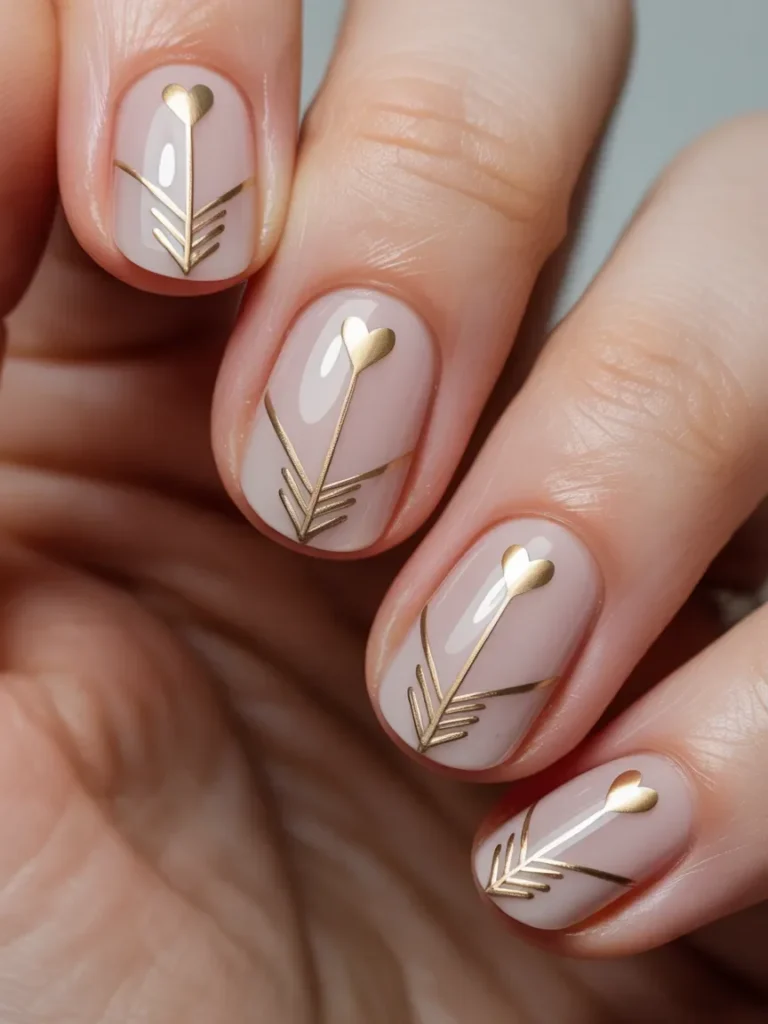 This elegant design features a soft nude base with intricate gold arrow details, each ending in a small heart. The combination of the neutral base and shiny gold creates a sophisticated and refined look. The arrows point towards the hearts, adding a playful and romantic touch.