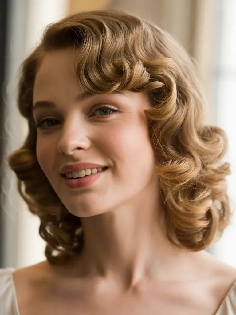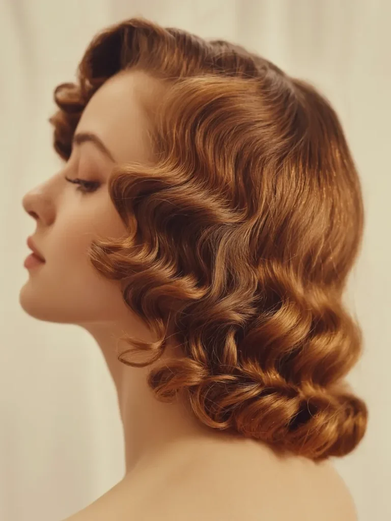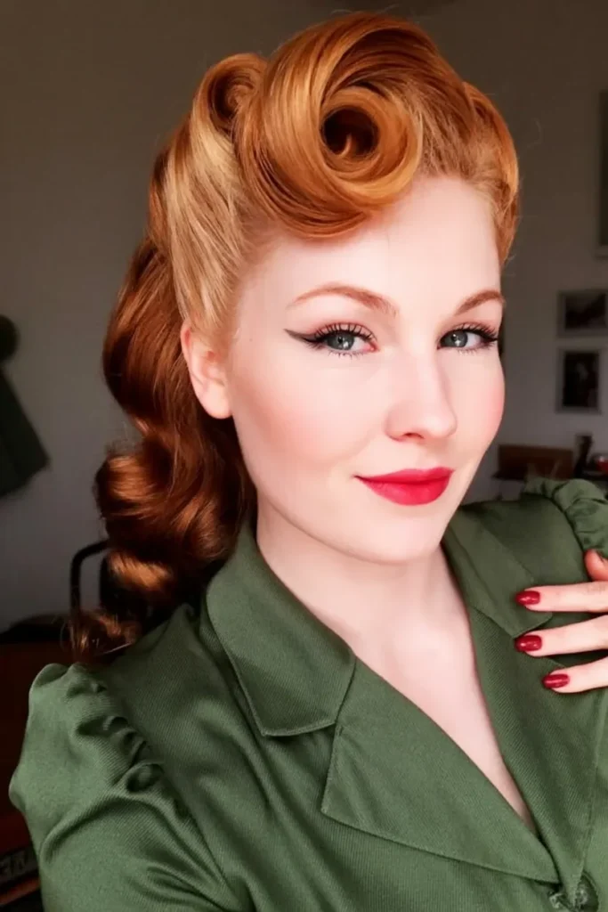 The side part adds structure and balance, guiding the eye across the face while highlighting cheekbones and jawline with subtle drama. Each wave looks carefully shaped, showing the craftsmanship that made pin up hairstyles timeless and expressive.