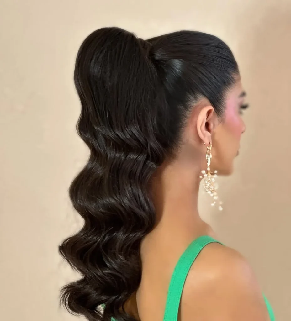 This vintage pin up hairstyle blends a sleek high ponytail with soft flowing waves that fall gracefully down the back. The smooth crown creates a clean silhouette while the waves add movement and a touch of old school glamour.