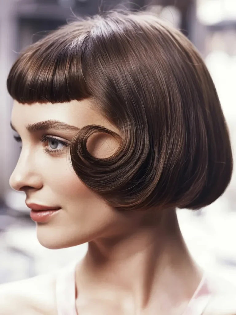 This vintage pin up hairstyle brings a polished city charm through a smooth bob shaped with defined finger waves. The short fringe sits neatly across the forehead, adding structure while keeping the look soft and balanced.