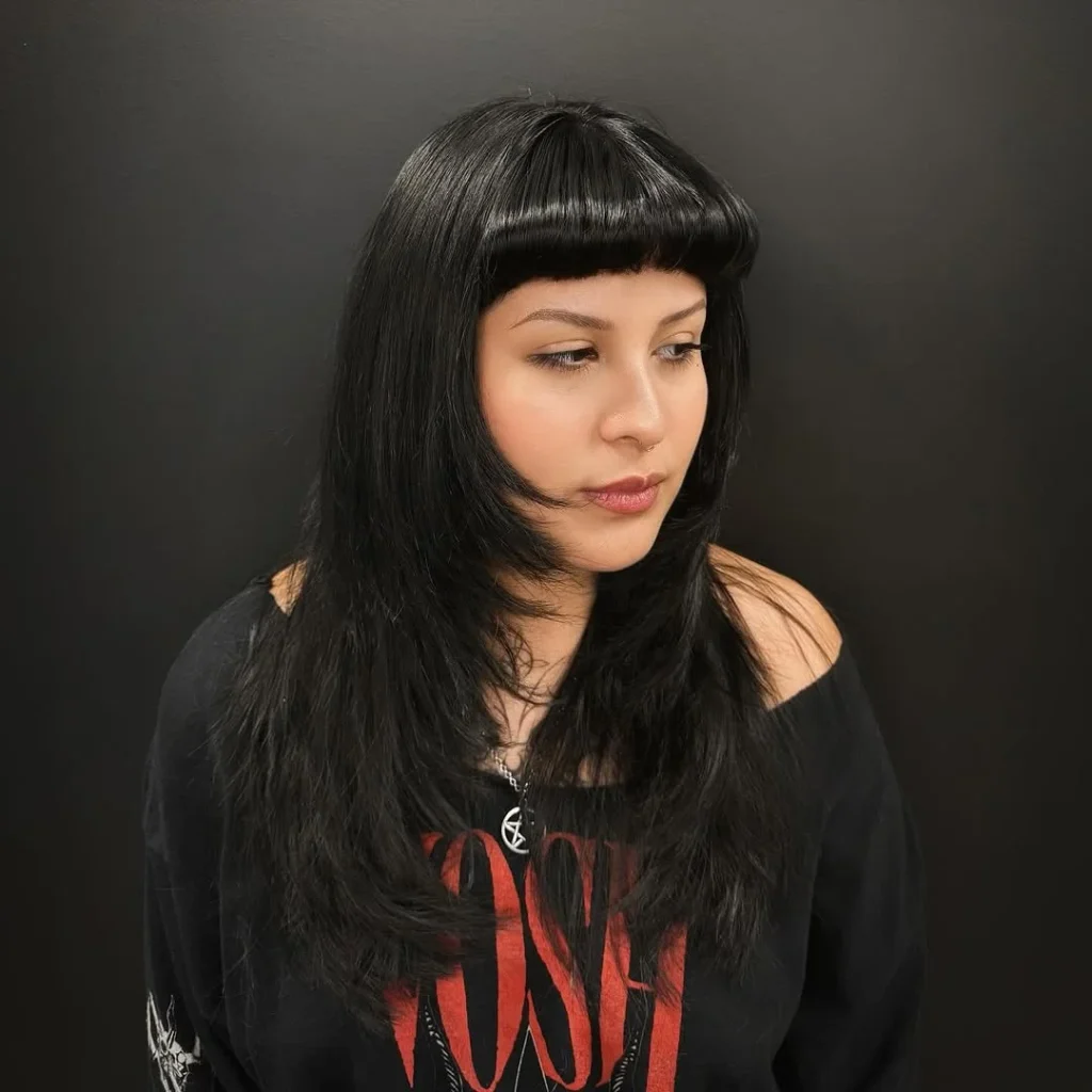 This vintage pin up hairstyle channels a bold retro attitude through sharp blunt bangs paired with long flowing layers that frame the face with confidence. The fringe sits clean across the forehead, creating a strong focal point that instantly brings classic pin up energy into a modern setting.