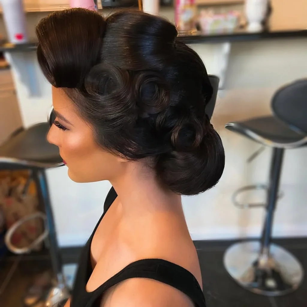 This look works beautifully for formal events, retro themed gatherings, or styled photo sessions inspired by old Hollywood glamour. The lifted crown helps elongate the profile while drawing attention to the eyes and cheekbones.