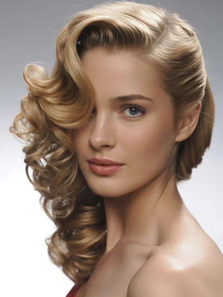 This vintage pin up hairstyle features a deep side sweep that instantly draws attention to the soft, sculpted curls. Volume at the front blends smoothly into flowing waves, creating a look that feels graceful and confident.