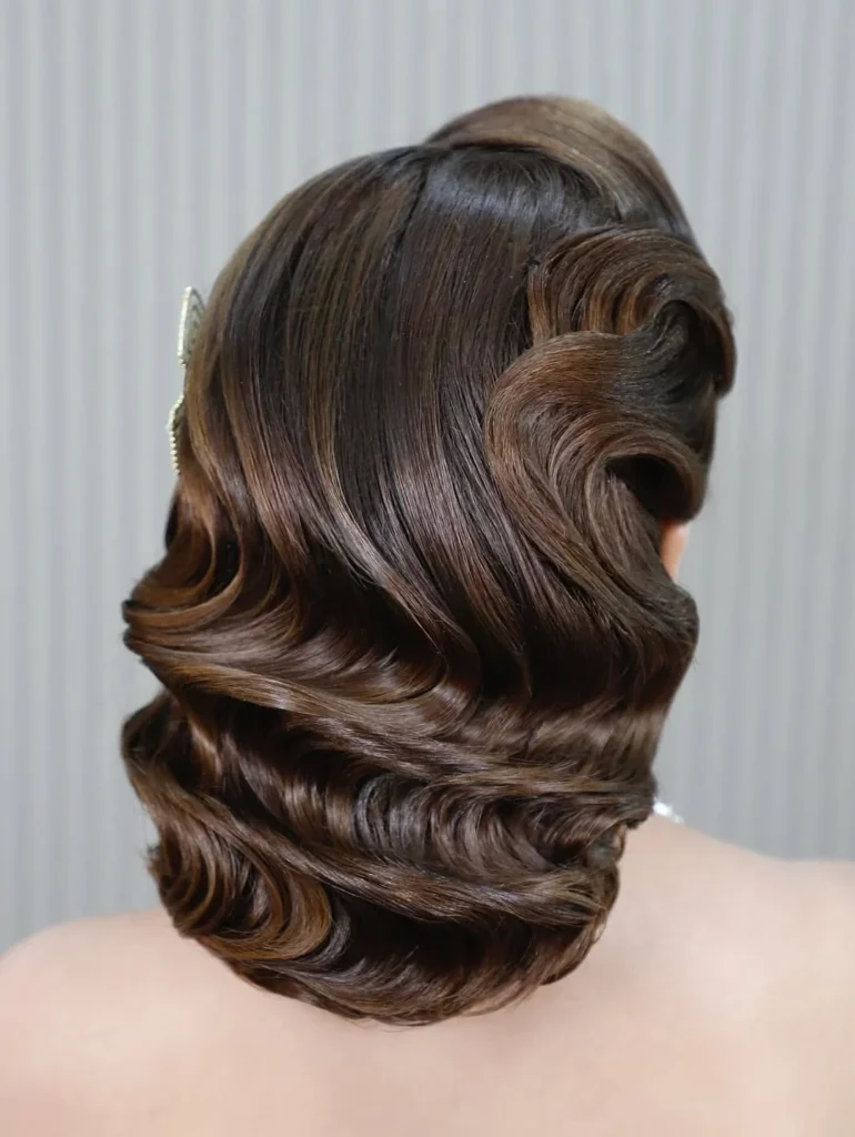 This style pairs beautifully with evening looks, vintage dresses, or modern outfits that need a touch of old Hollywood charm. Despite its structured appearance, the hair still feels fluid and natural, never stiff or overly styled.