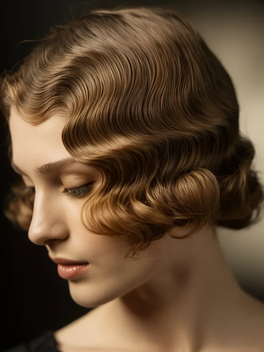 This vintage pin up hairstyle captures classic finger waves sculpted close to the head, creating smooth curves that flow with elegance and quiet confidence. Soft light reflects off the polished waves, giving the hair a rich texture that feels refined yet full of character.
