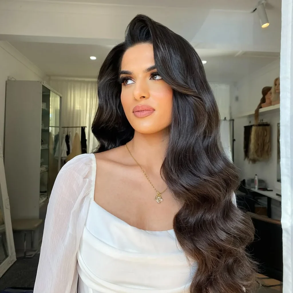 This vintage pin up hairstyle captures old Hollywood glamour through deep side parted waves that flow smoothly over one shoulder. The glossy finish and soft bends create a polished look that feels timeless yet graceful.
