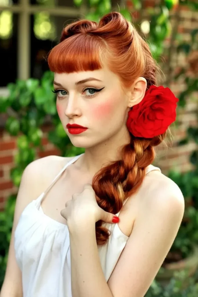 A bold floral accent tucked near the braid adds character and draws attention to the overall silhouette. Classic eyeliner and a defined lip work in harmony with the hairstyle, keeping the vintage mood strong and confident.