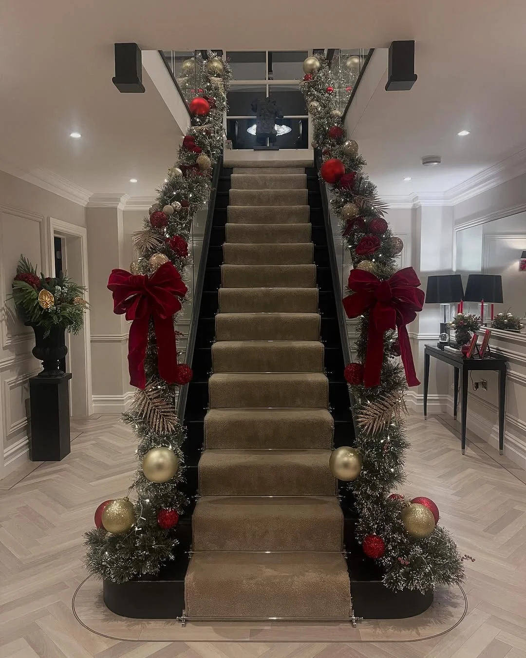 Each step feels wrapped in Christmas cheer as the garland flows from top to bottom in a graceful trail. Under the soft lighting, the gold accents shimmer beautifully, adding a hint of luxury without taking away the cozy feel.