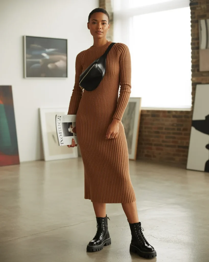 This ribbed knit dress brings effortless sophistication to winter fashion. The warm caramel tone flatters every skin tone, while the fitted yet comfortable texture highlights the body’s natural shape.