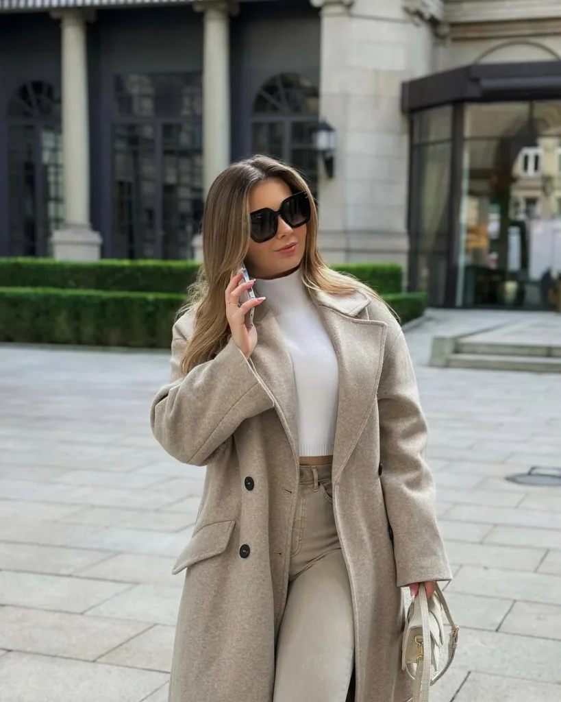 This elegant winter outfit captures the charm of minimalism with soft beige tones and refined layering. The long wool coat drapes gracefully over a white fitted sweater, creating a clean and cozy silhouette.