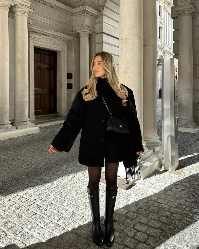 This all-black winter look radiates elegance with a hint of mystery. The oversized wool coat adds structure and warmth, while the short hemline gives the outfit a modern, youthful twist.