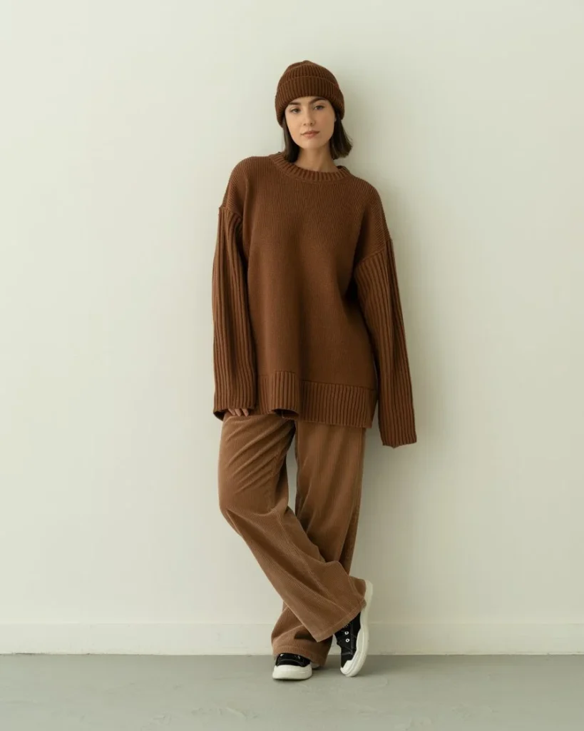 This warm brown outfit captures the essence of effortless winter comfort. The oversized knit sweater pairs beautifully with soft corduroy trousers, creating a relaxed silhouette that feels both chic and inviting.